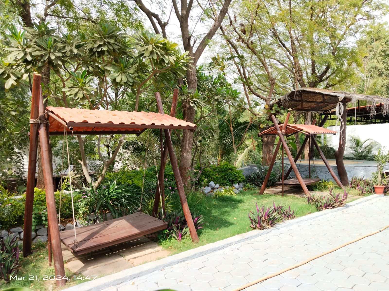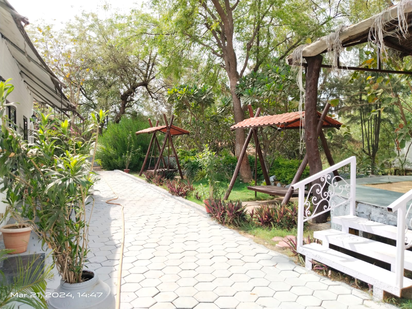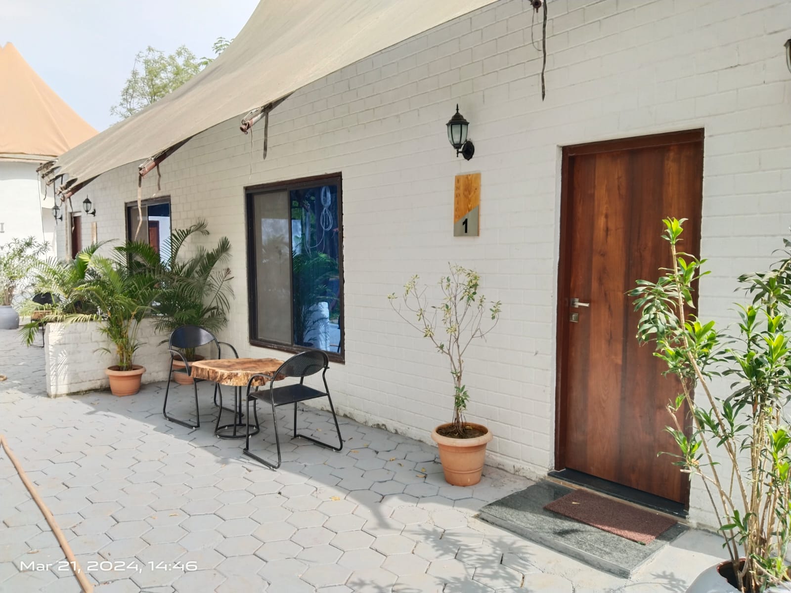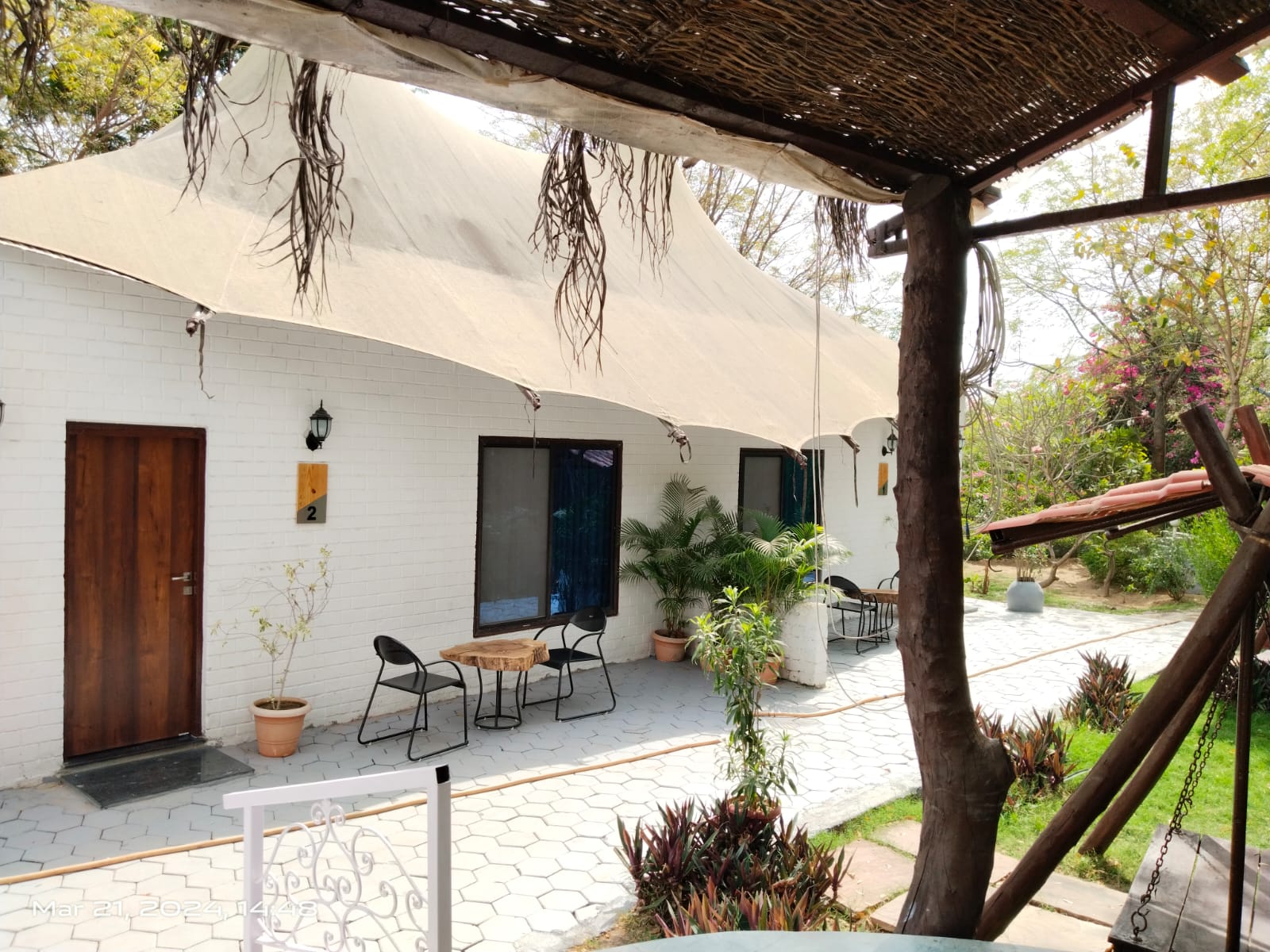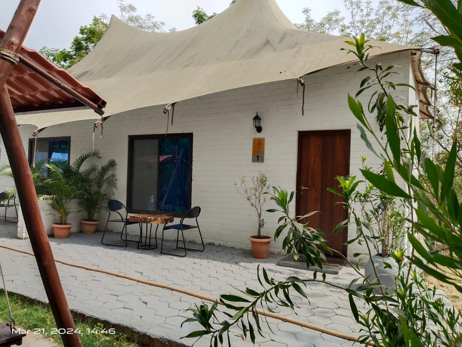 A charming glamping room featuring a small private swing just outside the room—perfect for relaxing and spending quality time with friends. Set in a secluded and peaceful environment, the space is wrapped in distinct silence and natural calm, allowing you to fully unwind and enjoy your stay. The blend of comfort, privacy, and serenity makes it an ideal spot for laid-back conversations and quiet moments in nature.